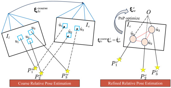 Upon establishing the 3D–2D matching relationships, we construct a pose graph. As expressed in Equation (7), we employ the coarse relative pose in conjunction with the last frame’s pose to derive the initial pose of the current frame.