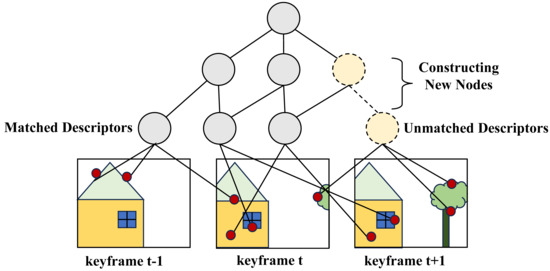 An illustration of our proposed Online Learning-based Binary BoW. The BoW is constructed incrementally, with matched descriptors in the keyframes database stored within the same leaf node. In the presence of unmatched descriptors in the current keyframe, a new leaf node is created.