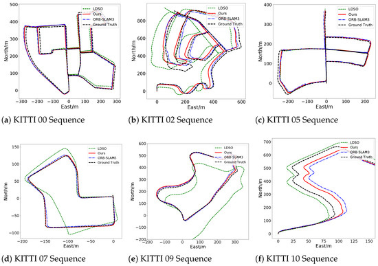 To evaluate the effectiveness of our SLAM system in the car-driving scenario, we conducted experiments using the KITTI dataset and employed the official evaluation metrics, computing root-mean-square error (RMSE) for both translation and rotation vectors. This evaluation spanned sequences ranging from 100 m to 800 m, providing an overall metric for pose accuracy. We conducted a comprehensive assessment of our SLAM system’s tracking and loop closure capabilities in complex environments, focusing on Sequences 00, 02, 03, 04, 05, 06, 07, 08, 09, and 10 from the KITTI dataset. We excluded Sequence 01 from our evaluation due to its unique challenges for monocular SLAM systems, as a highway scene with few distinctive feature points, especially near the horizon, led to significant scale degradation in monocular SLAM performance.
