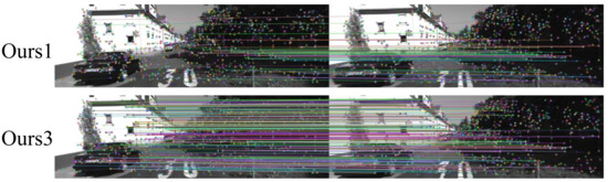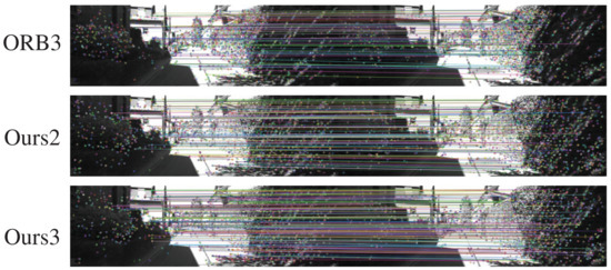 Table 4 presents the average number of matching points for ORB-SLAM3, Ours2, and Ours3 on Sequences 00, 05, 09, and 10 of the KITTI dataset. Setting the total number of keypoints to 3000 and the pyramid level to 3, MAML-based training significantly improves the feature detection performance of SuperPoints, allowing them to acquire more robust features and enhancing SLAM accuracy.
