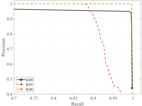 Precision–recall curves depicting the performance of the Bag-of-Words (BoW) approach in the proposed DK-SLAM on Sequences 00, 05, and 06 of the KITTI dataset.