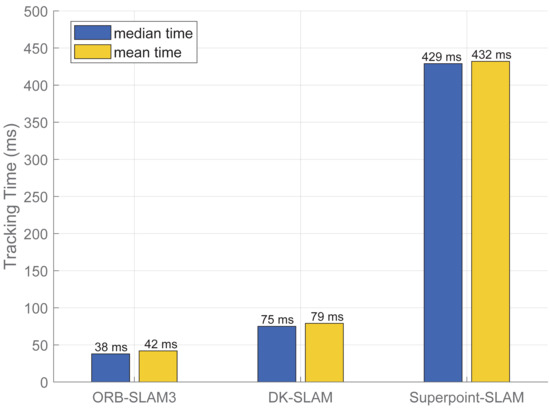 Comparison of tracking time of ORB-SLAM3, DK-SLAM, and SuperPoint-SLAM.