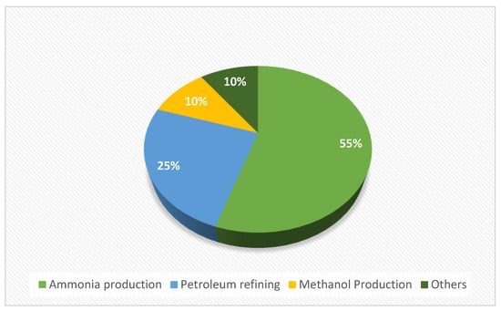 Hydrogen has been identified as a promising and key solution to achieving the net-zero greenhouse gas emissions commitments announced in recent years; it is a versatile and eco-friendly energy carrier with numerous applications in power generation, transportation, and industrial sectors [8,9,10]. The global industrial percentage of hydrogen consumption is shown in Figure 1.