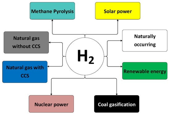 The potential of hydrogen to decarbonize several industries has led to a recent surge in the demand for hydrogen as a clean energy carrier on a global scale [12,13]. Its global demand reached 94 million tonnes (MT) in 2021 and is estimated to rise to 115 million tonnes (MT) by 2030 [14]. Hydrogen can be produced from various sources, and the color of the hydrogen distinguishes its production method as shown in Figure 2 [15,16].