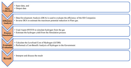 This study applied a comprehensive approach to evaluate the feasibility of converting flare gas to hydrogen production from both operational and economic perspectives. Data were collected from the Nigerian National Petroleum Company’s Annual Statistical Bulletin. Data Envelopment Analysis (DEA) and inverse DEA were applied to conduct an efficiency assessment of oil companies operating in Nigeria and to estimate the maximum potential reduction in flare gas. After this, a process simulation was performed using Aspen HYSYS to model the conversion of flare gas into hydrogen. Finally, an economic analysis was performed. Figure 4 shows a simplified process flow diagram of the method.