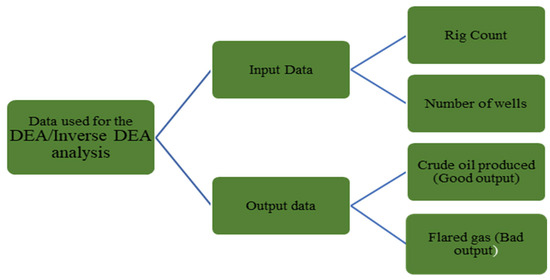 Data for this analysis were obtained from the Annual Statistical Bulletin of the Nigerian National Petroleum Corporation (NNPC). This Federal Government website provides access to open data on crude oil and natural gas production over different years. The selection criteria were based on factors influencing GHG emissions and production rates. The factors identified by [42,45] include the total number of wells, rig count, crude oil produced, and flared gas. These data were classified as input and output, with outputs categorized into good and bad. The process simulation data is shown in Figure 5 and Table 1.