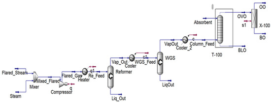 The model has two feed streams: The flare stream and the steam stream. Both streams were passed into a mixer and then into a compressor. During the industrial SMR process with CCS, natural gas reacts with steam to produce high-quality hydrogen as shown in Equation (4) [57,58].