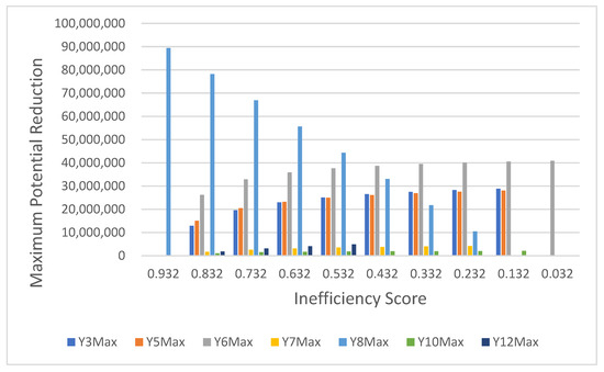 To determine the maximum potential reduction in gas that the inefficient producers will save, the inverse DEA proposed by [46] was used as shown in Equation (3)