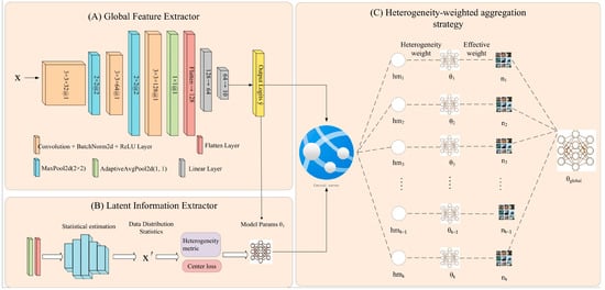 This multi-loss design not only improves the model’s representation ability on local data but also enables effective modeling and adaptation to inter-client distribution differences under the guidance of the heterogeneity quantification mechanism. By introducing heterogeneity-aware losses based on feature statistics, the model dynamically perceives and responds to non-IID characteristics, thereby guiding the local model convergence toward the global distribution during training. This design provides a unified and stable feature representation foundation for subsequent heterogeneity-aware aggregation.