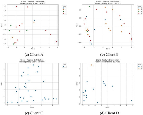 To further validate the effectiveness of the proposed heterogeneity quantification mechanism, we selected four representative clients and visualized their feature distributions and corresponding heterogeneity scores, as illustrated in Figure 3. In each subfigure, samples are projected into a two-dimensional space using Principal Component Analysis (PCA), with colors indicating class labels. The heterogeneity score of each client is displayed in the title.