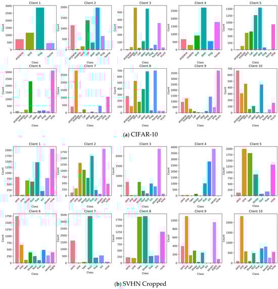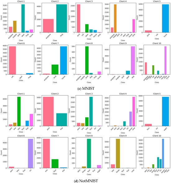 It can be observed from Figure 3 that the samples of Client A and Client B come from multiple categories with a relatively uniform distribution, and the heterogeneity scores are only 28.05 and 29.18, reflecting relatively balanced IID characteristics. The distribution of the Client C and Client D samples is extremely biased towards a single category or a small number of categories, and the corresponding heterogeneity scores are as high as 68.47 and 59.75, respectively, indicating a significant class imbalance. However, one class is absolutely dominant, showing a moderately high distribution deviation, so the heterogeneity scores are high.