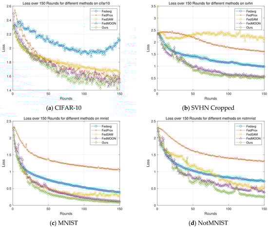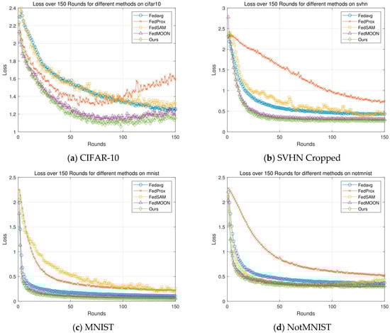 As shown in Figure 5 and Figure 6, which compare the training loss curves, throughout the 150 training rounds on each dataset, the proposed method consistently maintains the lowest loss curve, demonstrating a faster convergence and superior stability. Whether in Figure 5 (alpha = 0.5) or Figure 6 (alpha = 0.1), FedAvg shows a slow loss reduction and a relatively high final loss value, while FedProx performs slightly better but still suffers from considerable fluctuations.