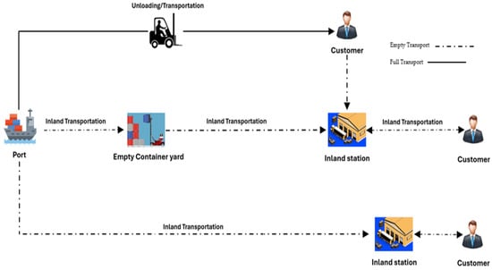 Building on the container flow illustrated in the previous figure, further operational details reveal how storage policies, repositioning needs, and customer distribution patterns shape the inland handling of empty containers. To avoid such additional storage costs and customs complexity inside the port, all empty containers are pulled out by any inland transportation modes to the inland freight station. All the empty containers stay idle in the inland station waiting to receive a customer’s request. In general, the customers are not located directly near the inland depot; therefore, shipping companies must arrange for the transportation of empty containers directly to the customer’s location within the hinterland. This means that repositioning of empty containers should be conducted between depots to restore balance in the distribution of containers across the entire service network, in alignment with transportation demand. Hence, when the shipping line receives a booking request from the customer, it moves empty containers to be transported to their premises by inland transportation.