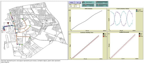 The model uses GIS shapefile and CSV as inputs to generate the port, empty yard, inland terminal, and customer premises. The model simulates the movement of empty 20 ft containers using 40 ft trucks in a two-depot system within Jeddah, Saudi Arabia. Figure 2 shows the interface of the build model; the GIS-based map on the left visualizes the road network, with truck movements. The color-coded symbols indicate ports (red star), empty container depots (red squares), and inland depots (green dots). The model uses four plots monitoring CO2 emission of empty truck movements, container status, waiting time of customers, and unmet demand. The GHG emission plot measures the increase in CO2 emissions over time based on real-world fuel consumption, which may require optimization. The truck container status plot exhibits a cyclical pattern, indicating that trucks continuously switch between loaded and unloaded states, reflecting a hub-and-spoke logistics system. Additionally, the customer waiting time and the unfilled demand plot also show if a customer faces a delay in receiving their containers, or if the demand is not being met. To enhance the efficiency of the model, several sliders/switches are added to adjust the actions taken by the agents, whether at the start-up process or during run-time.