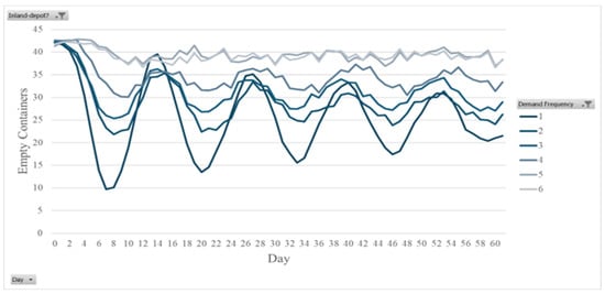 The sensitivity analysis conducted via Behavior Space confirmed the robustness of these trends across a range of demand frequencies and routing strategies. By comparing the two operational scenarios with inland depot coordination (inland-depot? = true) and without depot usage (inland-depot? = false), the simulation highlights key differences in system efficiency, emissions, and service quality. The results show that container availability, customer waiting time, and CO2 emissions are highly related to the customer demand frequency. Subsequently, Figure 3 shows the variation in the number of empty containers over time (in days) based on different demand frequency levels (from 1 to 6) within the model.