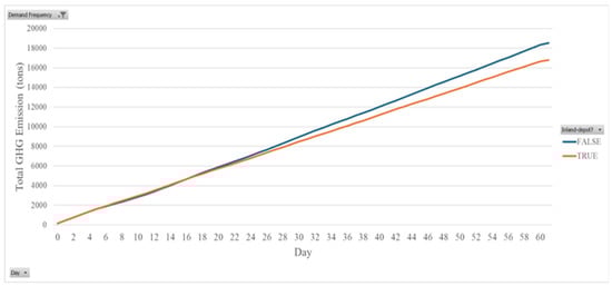 Figure 4 illustrates the cumulative GHG emissions in tons over time under two different scenarios. Both scenarios show steadily increasing total GHG emissions over time, following a nearly linear growth pattern. When inland depots are used, which is represented by the orange line, emissions increase at a slightly lower rate, resulting in approximately 1000–1500 tons less CO2 emissions compared to the direct routing system. This scenario can reduce the total CO2 emissions by approximately 15–25% compared to direct customer routing. This is due to the better consolidation of container movements, reducing unnecessary trips. However, if trucks move directly to customer locations without utilizing the depot, emissions accumulate at a faster rate, resulting in a 20–30% increase in emissions due to increased trips and empty backhauls.