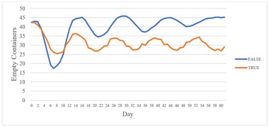 Figure 5 demonstrates the number of empty containers over time under two different scenarios. When the inland depot is utilized, the number of empty containers stabilizes at a consistently lower level. The inland depot functions as a buffer, allowing for better coordination and redistribution of empty containers, which reduces the peaks and troughs seen in the other scenario. It leads to a reduction in empty container accumulation, implying that containers are being utilized more efficiently rather than sitting idle in depots or ports. This indicates a more balanced and efficient system where empty containers are allocated in a way that aligns better with demand patterns, whereas the number of empty containers in the direct strategy exhibits more pronounced fluctuations, with sharp drops and recoveries throughout the simulated period. This suggests inefficiencies in container circulation can be addressed to reduce bottlenecks in the supply chain.