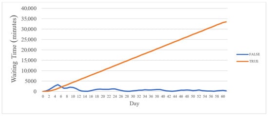 Figure 6 measures the average customer waiting time over the simulation period for both scenarios. The relationship between customer waiting time, unmet demand levels, and the configuration of the inland depot is very significant. Moreover, the results show that when an inland depot is used, customer waiting time increases exponentially, suggesting severe delays. Conversely, without an inland depot, waiting times remain stable. This means that direct routing ensures a more efficient and responsive supply chain, with containers reaching their destinations in a timely manner. However, it may lead to higher unmet demand if trucks are not available when needed. Meanwhile, the result shows that while the inland depot system may be beneficial in terms of environmental impact and overall container efficiency, it comes at the cost of severely reduced service levels for customers.