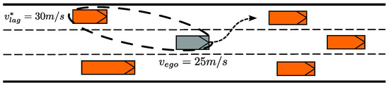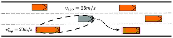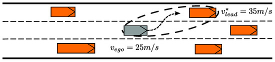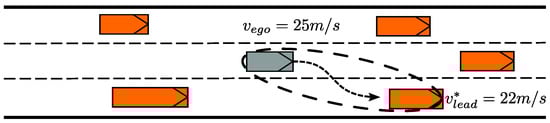 In analogy to Case 1, a minimum distance to the lead vehicle in the neighboring lane, based on Equation (7), must be ensured whenever the ego vehicle’s speed is lower than that of the vehicle ahead (see Figure 4).