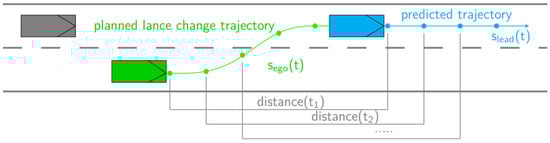 Figure 6 shows schematically the approach to determining if a planned lane-change trajectory is compliant with the norm. Although this concept is valid for lane-change trajectories as well as for maintain-lane trajectories, the approach in this paper is demonstrated for a lane-change maneuver. First, the trajectory of the lead vehicle affected by the planned maneuver has to be predicted. In Figure 6, the predicted trajectory of the lead vehicle on the target lane is highlighted in blue. For the prediction of , the velocity of the lead vehicle is assumed to be constant during the lane-change maneuver of the ego vehicle. The planned lane-change trajectory of the ego vehicle , highlighted in green in Figure 6, is calculated by the ego vehicle’s trajectory-planning module. Then, , the difference between the distances traveled by both vehicles in each time step, is calculated. represents a vector containing the distance between the ego and the lead vehicle at each time step.