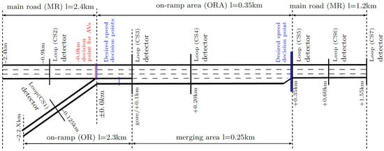 Equation (11) considers the acceleration of the ego vehicle and the deceleration of the lag vehicle in the target lane . This formulation takes into account both the acceleration capabilities of the ego vehicle and the assumed deceleration behavior of the lag vehicle, denoted as , which reflects the maximum deceleration the lag vehicle is expected or permitted to apply in cooperative situations. The value of this accepted deceleration is critical from both a safety and traffic flow perspective. It directly influences how assertively an AV can merge with flowing traffic. The selection of this parameter is context-dependent and can vary with the urgency of the maneuver and the location on the road. For example, merging from an on-ramp typically allows for greater deceleration values from following vehicles than a standard overtaking maneuver. Moreover, this parameter also plays an important role in enabling cooperative behaviors from vehicles already on the main carriageway, especially in the vicinity of merging zones. As such, its systematic evaluation was a focal point in the use-case scenarios presented in this study.