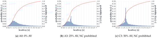 Regarding lane-changing, the results of scenarios C3 and D3 are shown in Figure 11a–c and Figure 12b,c. Both scenarios considered an AV penetration rate of 50% and the AVs had to keep a minimum time headway of 1.8 s. In scenario C3, non-compliant trajectories were prohibited, whereas AVs were allowed to reduce the time headway () to 1.0 s for a maximum duration () of 5 s in scenario D3.