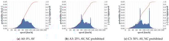 A similar effect can be seen in the speed distributions (Figure 10a–c). The peak between 70 and 90 km/h was due to merging vehicles in the on-ramp area, which were still in their acceleration phase and not yet driving at the desired speed. In addition, the speed distributions of scenarios A3 and C3 showed peaks at 80 km/h and 130 km/h, reflected by AVs being on the main carriageway. AVs did not exceed the maximum allowed speed (130 km/h for cars and 80 km/h for trucks) but tried to minimize travel time, which is why they drove at the maximum allowed speed in free-flow traffic situations. The higher the AV penetration rate, the higher the share of vehicles travelling at maximum allowed speed but the lower the amount of drivers driving too fast.
