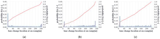 Lane change location distribution of scenarios C3 and D3. (a) C3: LC location of human drivers; (b) C3: 50% AV, NC prohibited LC location of AVs; (c) D3: 50% AV, NC permitted LC location of AVs.