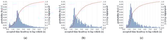 In addition, differences can be observed regarding the gap acceptance behavior in Figure 12a–c, which also explains the improved merging behavior of AVs when the non-compliant mode was permitted. The distribution in Figure 12a for human-driven vehicles shows a small peak at very low time headways. Further analysis revealed that these low headways usually occurred in situations when the lag vehicle in the target lane was a rather slow vehicle (e.g., a truck). These low time headways cannot be observed when analyzing the gap acceptance behavior of the developed automated driving functions, as a safety distance to surrounding vehicles was considered within the AV lane change model.