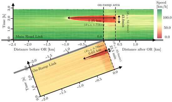To analyze the impact on traffic flow, spatiotemporal speed profiles are presented for varying penetration rates and different AV driving regulations (Figure 13, Figure 14 and Figure 15). The distance before and after the on-ramp area is shown on the x-axis. The color indicates the observed average speed in space and time with a resolution of 25 m and 30 s, derived from the simulated trajectory data. The red colored areas indicate congested traffic. It can be seen that free-flow traffic was faster on the main road compared with the on-ramp link. As described in Leyn and Vortisch [43], the speed on the on-ramp link usually decreases slightly before the on-ramp area, due to increased road curvature. Therefore, the desired speed was slightly lowered 200 m before the on-ramp area, which is indicated in orange.