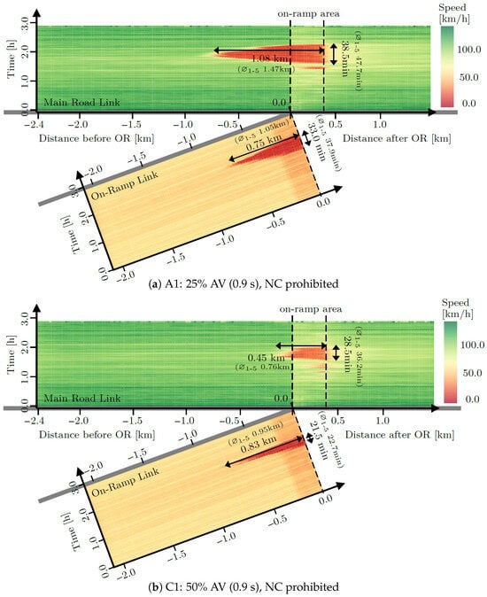 Since the traffic volume decreased after two thirds of the simulation time, the dissolution of congestion can also be observed. For the base case scenario (see Figure 13), congested traffic lasted for 43.0 and 23.5 min on the main road link and the on-ramp link, respectively. Figure 14 presents the spatiotemporal speed profiles of scenario A1 and C1. In both cases, non-compliant trajectories were prohibited and the desired time headway was set to 0.9s, which corresponds to rather risky behavior. While the AV penetration rate was set to 25% in scenario A1, scenario C1 considered an AV penetration rate of 50%. The results show that congestion was reduced on the main road if the AV penetration rates were increased. It needs to be mentioned that this was not the case if the desired time headway was set to a higher level, as shown by the results in Table 6. Moreover, congestion was not reduced at the on-ramp link when comparing the results with the base case scenario A0 in Figure 13. Increasing the AV penetration rate from 25% to 50% increased the maximum congestion length from 0.75 km to 0.83 km. In scenario C1, congestion on the on-ramp area started to emerge much later than in scenario A1. This led to a shorter time period of congested traffic on the on-ramp link.