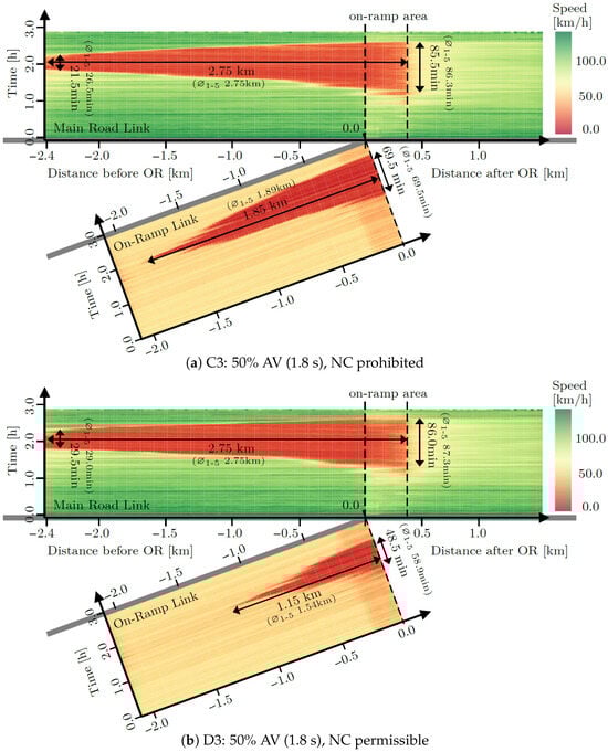 Next, we focus on the spatiotemporal speed profiles for scenarios C3 and D3, shown in Figure 15. Both scenarios were simulated with an AV penetration rate of 50% and the desired time headway was set to 1.8 s. In scenario C3, non-compliant mode was prohibited, while it was allowed in scenario D3. First, when comparing Figure 14b and Figure 15a, it can be seen that congestion increased drastically if the AVs’ desired time headway was increased from 0.9 s to 1.8 s. Additionally, the comparison of scenarios C3 and D3 shows that only minor differences could be observed on the main road. In both scenarios, the network was fully congested. In scenario C3, this was the case for a duration of 21.5 min. Allowing AVs to execute non-compliant trajectories prolonged this state by nine minutes. However, the overall duration of congestion in the on-ramp area did not change substantially. While the on-ramp area of the main road was congested for 85.5 min in scenario C3, this value increased slightly to 86.0 min in scenario D3. At the same time, major differences can be observed at the on-ramp link as it was possible to reduce congestion significantly when AVs were allowed to execute non-compliant trajectories. On the on-ramp link, the maximum congestion length was 1.85 km in scenario C3. This was reduced by 40% to 1.15 km in scenario D3.