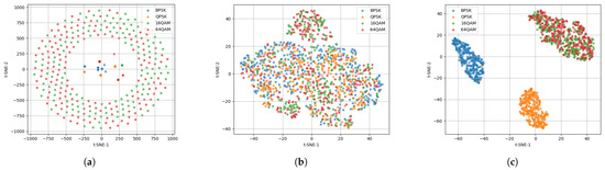 Data visualization based on t-SNE analysis. (a) Absolute values of signal. (b) Singular values of (with original signal). (c) Singular values of (with FFT-processed signal).