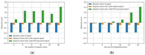 where denotes the average distance from sample i to all other samples in the same class and denotes the minimum average distance from i to all samples in any other class. The silhouette score , and the overall score is computed as the average over all samples. Values close to 1 indicate well-separated and compact clusters, while values near or below 0 suggest overlapping or poorly separated classes. As shown in Figure 2, we evaluate the silhouette score using three types of features. In Figure 2a, we vary the number of retained singular values while keeping the Hankelized matrix structure to be nearly square, following the definition in (2). On the other hand, in Figure 2b, we fix the number of singular values to use all available values and vary the row size when forming the Hankelized matrix. In both cases, singular values of (with the FFT-processed signal) consistently yield higher silhouette scores than the other approaches. Notably, as the structure of Hankelized matrix becomes more square-like, the FFT-based features show improved class separability. Therefore, in this work, we follow the Hankelization strategy that attempts to construct a nearly square matrix.