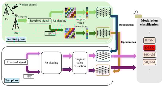 Conventional AMC methods can generally be categorized into likelihood-based and feature-based approaches [3,7]. The likelihood-based methods utilize probabilistic models and hypothesis testing to classify modulation schemes accurately under precise channel conditions but often incur prohibitively high computational complexity due to extensive parameter estimation processes, limiting practical deployment [8,9,10]. Conversely, feature-based methods involve classical machine learning (ML) algorithms such as support vector machines (SVMs), decision trees, and the k-nearest neighbors (k-NN) algorithm, which classify handcrafted signal features [3,11]. Although feature-based methods are generally simpler and computationally efficient, they often suffer from limitations related to the discriminative power of manually designed features and restricted learning capabilities inherent in conventional classifiers [12,13]. Moreover, such handcrafted approaches may not generalize well across different channel environments or unforeseen modulation formats.