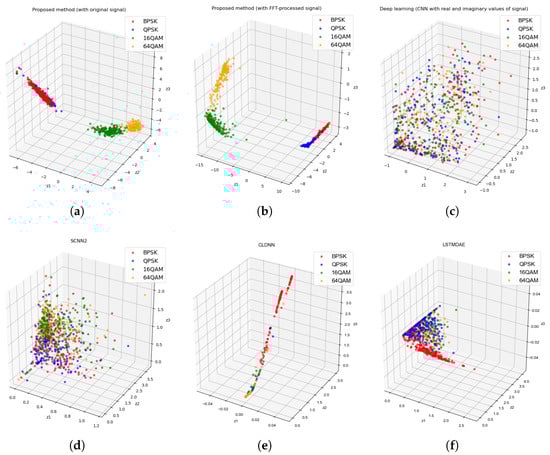 Data visualization based on latent space (SNR = 10 dB). (a) Proposed method (with original signal). (b) Proposed method (with FFT-processed signal). (c) Deep learning (CNN with real and imaginary values of signal). (d) SCNN2. (e) CLDNN. (f) LSTMDAE.