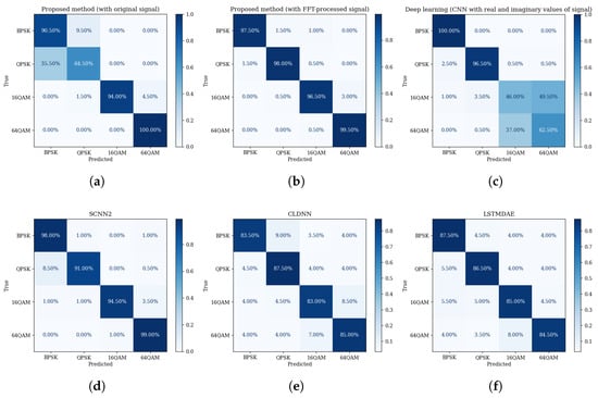 Confusion matrices (SNR = 10 dB). (a) Proposed method (with original signal). (b) Proposed method (with FFT-processed signal). (c) Deep learning (CNN with real and imaginary values of signal). (d) SCNN2. (e) CLDNN. (f) LSTMDAE.