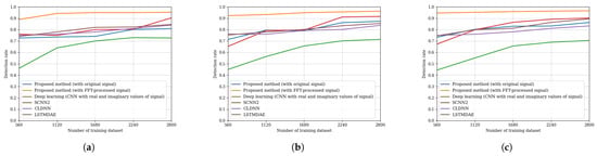 Across all SNR levels and training sizes, the proposed method (with FFT-processed signal), shown in orange, consistently achieves the highest detection rate. As shown in Figure 6a, even when trained with only 560 samples in total—corresponding to 140 samples per class under the SNR condition of 4 dB—the proposed method (with FFT-processed signal) maintains a detection rate approaching , demonstrating strong robustness under limited data availability.