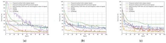 Figure 7 shows the test error curves across training epochs. The proposed method (with FFT-processed signal), shown in orange, consistently exhibits the fastest convergence and lowest test error across all SNR levels. Notably, under the SNR condition of 4 dB, as shown in Figure 7a, the proposed method (with FFT-processed signal) achieves a near-minimal test error within 30 epochs. The results highlight that the FFT-based method achieves faster convergence and learns robust, discriminative features effectively across varying conditions.