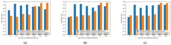 Detection rate according to row size for the Hankelized matrix. (a) SNR = 4 dB. (b) SNR = 10 dB. (c) SNR = 16 dB.