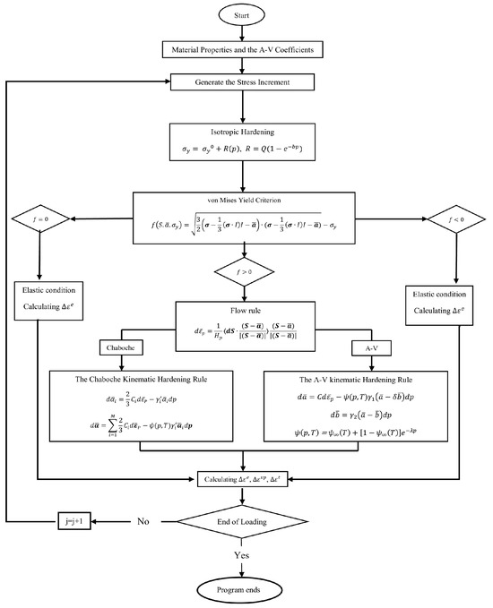 where the terms and are material-dependent coefficients determined from strain-controlled cyclic tests. The coefficients and were extracted from the slope of the linear part of the strain-based hysteresis loop. While controls the early, nonlinear accumulation of ratcheting strain during the first few cycles (typically 5–10 cycles), governs the steady ratcheting rate observed in the later stages (around 20–50 cycles). Both coefficients are obtained by fitting the model to measured uniaxial ratcheting data over the corresponding cycle ranges. The terms and are acquired through a trial-and-error procedure. The function was adapted into Equation (11c) to address the effect of dynamic strain aging (DSA) at elevated operating temperatures. Figure 1 presents a flowchart to address the procedure to assess ratcheting through the A-V and Chaboche hardening frameworks in the present study.