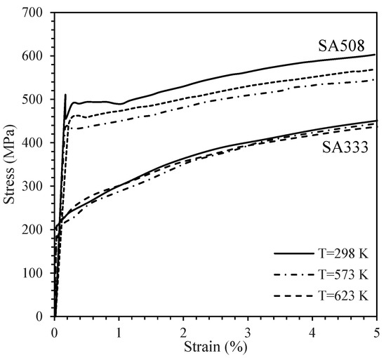 Stress–strain curves for SA508 and SA333 steel samples tested at various temperatures [51,52].