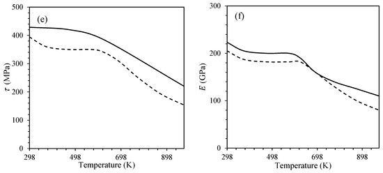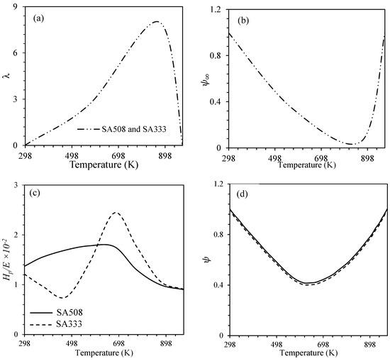 The mechanical response of steels, particularly under ratcheting conditions, is significantly influenced by operating temperature. Within the domain of dynamic strain aging (DSA), typically observed between 473 K and 873 K, dislocation motion is hindered due to solute–atom interactions, resulting in an abrupt increase in material strength and a pronounced hardening response [53]. To capture the influence of this phenomenon, an exponential temperature-dependent function, , was incorporated into the dynamic recovery term of the Ahmadzadeh–Varvani (A-V) hardening model. For both monotonic and cyclic loading, elevated temperatures led to a pronounced reduction in the elastic modulus, while the plastic modulus exhibited a rising trend and then a noticeable drop at magnitudes within the DSA temperature range. The exponent λ in this function plays a central role, reaching its peak within the DSA domain, thereby minimizing . At higher temperatures, such as above 900 K, λ decreases significantly, leading to 1.0, indicating the vanishing effect of DSA on material behavior. Figure 3 presents the variations in terms , , , , , and for steel samples versus operating temperatures.