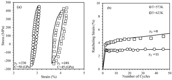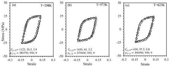 Chaboche’s coefficients and for SA333 steel samples tested at (a) 298 K, (b) 573 K, and (c) 623 K [54].