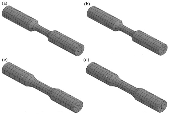 To simulate the ratcheting behavior of the SA508 and SA333 steel samples, finite element models were constructed using ANSYS 2022 R [55]. As shown in Figure 6, two different element types were examined to evaluate mesh sensitivity in the analysis. Each sample has a different geometry because the data were obtained from different experimental studies, and the specimen designs reflect the original configurations used in those sources [51,52]. The geometries correspond to standard axisymmetric tensile specimens, and both nonlinear brick and tetrahedral solid elements were implemented. The solid elements were generated using the sweep mesh technique, which involves creating a mapped mesh on a source face and extruding it through the volume to form structured meshing. The mesh structures were designed with brick and tetrahedron elements containing 20 and 10 nodes, respectively. The details of the element type, shape, and nodal features employed in this study are provided in Table 2. The models were constrained at one end to restrict motion in all directions, and cyclic boundary conditions were applied at the opposite end to replicate consistent sinusoidal loading patterns.