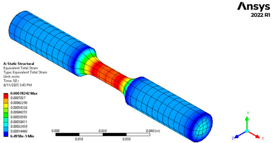 Figure 8 displays the distribution of total strain across the SA333 steel sample subjected to cyclic loading. The equivalent total strain contour reveals that the maximum deformation is concentrated at the gauge section, where the smallest cross-sectional area exists. This location recorded a peak total strain value of approximately 7.82 × 10−4, while the minimum strain, occurring at the outer ends of the specimen, remained close to 6.49 × 10−5. The strain gradients diminish progressively as the distance from the gauge region increases, indicating the local concentration of plastic deformation. These results were derived by finite element simulation in ANSYS 2022 R1. The strain values are computed at the Gaussian integration points and then extrapolated to nodal locations for contour visualization. This procedure relies on element shape functions to interpolate the results, providing smooth and representative strain distribution along the sample geometry.