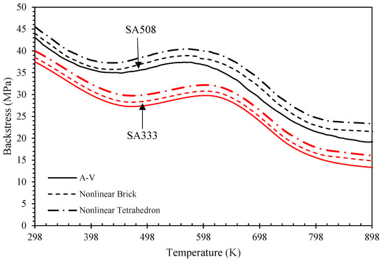 Figure 9 presents the evolution of backstress as a function of temperature for both the SA508 and SA333 steel alloys under different element structures. The numerical results obtained for the nonlinear brick elements and nonlinear tetrahedral elements were compared by the analytical (A-V) method. Across all element types, SA508 consistently exhibited higher backstress levels than SA333 due to its greater resistance to plastic deformation. A decreasing trend in backstress was observed as the temperature increased from 298 K to 898 K, which corresponds to the typical thermal softening behavior of steels. However, a slight elevation in the backstress magnitude was identified within the intermediate temperature range, suggesting the influence of dynamic strain aging (DSA). This temporary increase is attributed to solute dislocation interactions that restrict dislocation motion, requiring higher backstress to maintain cyclic plasticity. At temperatures below 473 K, solute atoms do not diffuse rapidly enough to influence dislocation dynamics, and DSA remains inactive. Above 873 K, dislocations move too quickly, and dynamic recovery dominates, causing DSA effects to disappear. The difference in backstress evolution between the two materials is also influenced by their microstructures and alloying content. SA508, with higher carbon and alloying element contents, typically forms a finer martensitic or bainitic structure that resists dislocation movement more effectively than the ferritic–pearlitic microstructure of SA333. As a result, SA508 maintains a higher backstress level under similar thermal and loading conditions. Overall, the predicted values using different element types showed close agreement, confirming the robustness of the hardening model and its implementation in various mesh schemes.