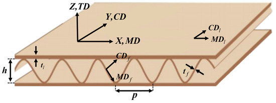 - Biancolini, M.E. Evaluation of equivalent stiffness properties of corrugated board. Compos. Struct. 2005, 69, 322–328. [Google Scholar] [CrossRef]