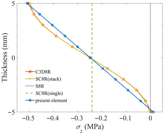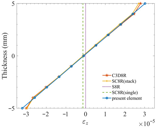 - The plate element, implemented through the user subroutine UEL in Abaqus 2022, can pass the patch test. The transverse normal strain and stress are linearly distributed along the thickness direction, which is consistent with results from the Abaqus native elements S8R, SC8R, and C3D8R.