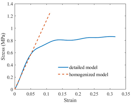 - By developing extensions to the established homogenization method and improving the out-of-plane stiffness, results from the homogenized model are well matched to the detailed model, with an error of less than 8% and a runtime reduction of more than 50%. The stress-strain relation of the homogenized model shows good agreement in the linear stage on the out-of-plane compression test, showing the correctness of the proposed method and the limitations of the linear elastic constitutive model.
